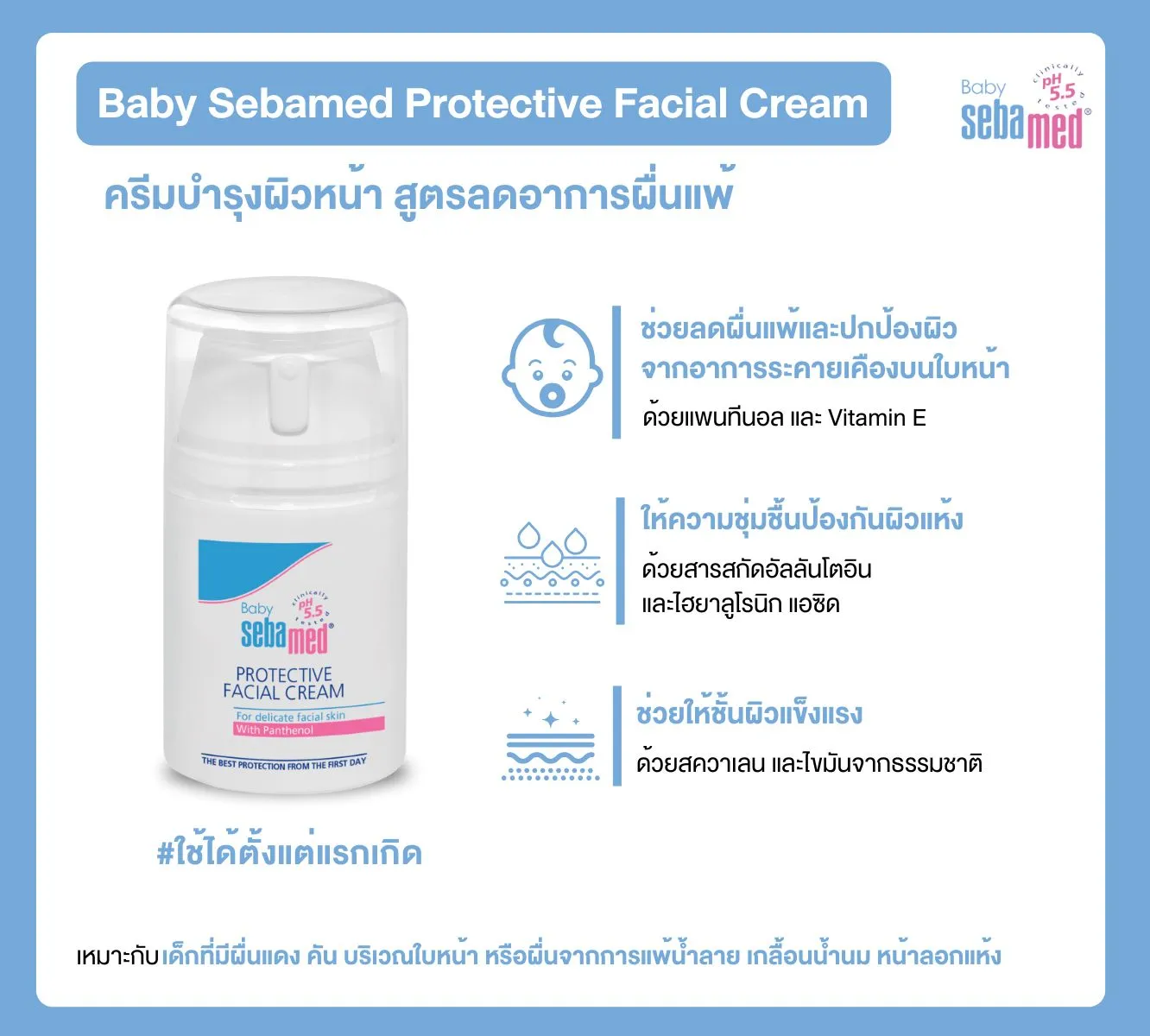 Baby Sebamed Protective Facial Cream เป็นครีมบำรุงผิวที่ออกแบบมาโดยเฉพาะสำหรับเด็กที่มีผิวบอบบาง มี pH 5.5 ซึ่งช่วยรักษาสมดุลความเป็นกรด-ด่างของผิวตามธรรมชาติ นอกจากนี้ ยังมี สารสกัดจากคาโมมายล์ ที่ช่วยลดการระคายเคือง และ แพนทีนอล ที่ช่วยบำรุงและฟื้นฟูผิวที่แห้งกร้าน