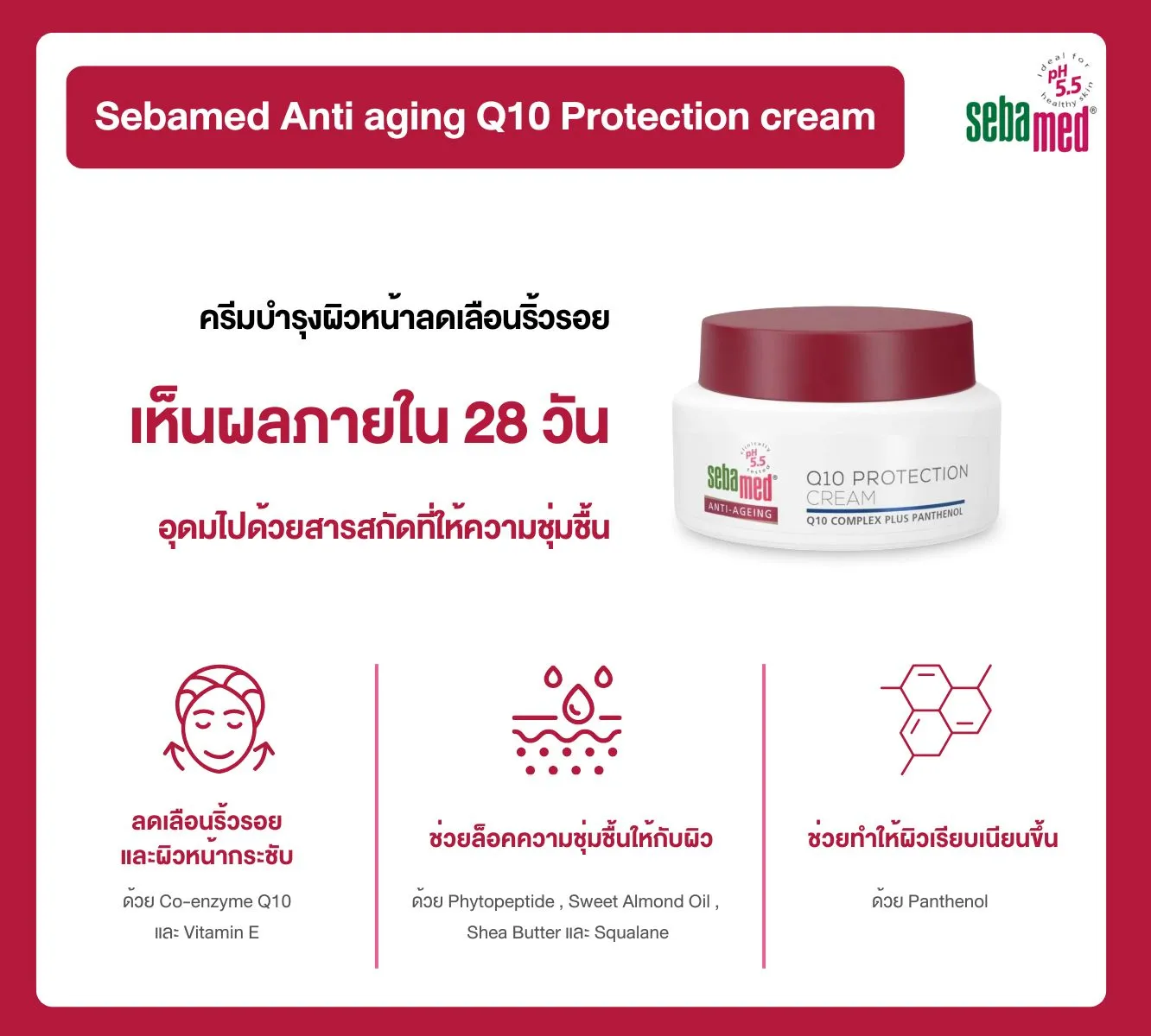 ครีมบำรุงผิวสูตร Sebamed Anti Aging Q10 Protection Cream เป็นตัวช่วยที่ตอบโจทย์ปัญหาผิวในวัย 50+ ได้อย่างตรงจุด ด้วยสารสกัดจาก Q10 ซึ่งช่วยในการชะลอการเสื่อมสภาพของเซลล์ผิวหนัง และเสริมการสร้างคอลลาเจน ช่วยให้ผิวดูกระชับ ลดเลือนริ้วรอย และเพิ่มความยืดหยุ่นให้ผิวกลับมาเรียบเนียนขึ้น