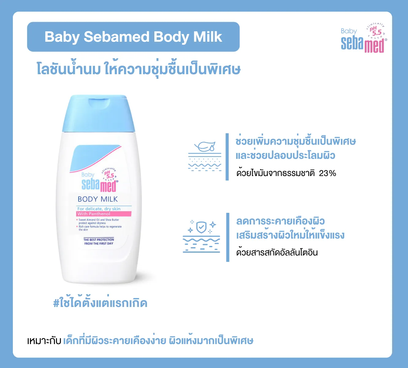 หลังจากการทำความสะอาดผิวแล้ว การบำรุงผิวด้วยมอยส์เจอร์ไรเซอร์ที่เหมาะสมเป็นสิ่งสำคัญยิ่ง Baby Sebamed Body Milk เป็นโลชั่นบำรุงผิวที่เหมาะสำหรับผิวบอบบางของเด็กเล็ก โดยเฉพาะเด็กที่มีแนวโน้มเป็นภูมิแพ้ผิวหนัง