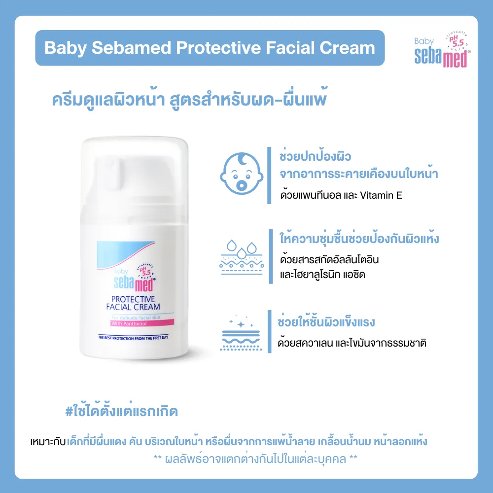 การเลือกใช้ผลิตภัณฑ์บำรุงผิวที่ช่วยเสริมเกราะป้องกันผิวจะช่วยลดการระคายเคืองได้ ควรเลือกผลิตภัณฑ์ที่ปราศจากสารเคมี น้ำหอม และพาราเบน เพื่อไม่ให้ระคายเคืองผิวที่บอบบางอยู่แล้ว ซึ่งเราขอแนะนำ Baby Sebamed Protective Facial Cream เป็นอีกหนึ่งตัวเลือกที่น่าสนใจสำหรับคุณแม่ เพราะมีค่า pH 5.5 ที่สมดุลกับผิวตามธรรมชาติของเด็ก พร้อมสารแพนทีนอลและออร์แกนิกคาโมมายล์ที่ช่วยฟื้นบำรุงผิวให้กลับมาแข็งแรงและลดการอักเสบ