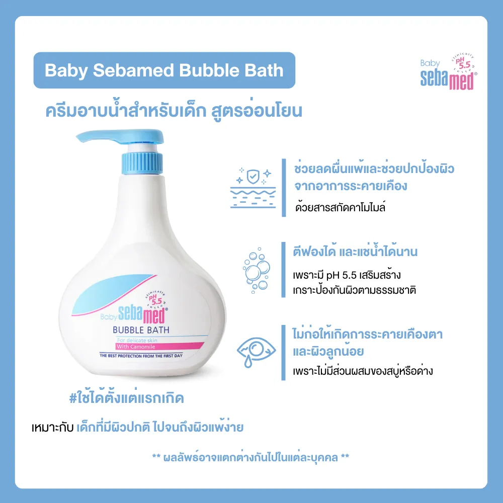 ด้วยการใช้ Baby Sebamed Bubble Bath ตัวช่วยทำความสะอาดที่อ่อนโยนที่สุด ช่วยพัดเอาฝุ่นละเอียดและสิ่งสกปรกให้หลุดออกไปอย่างหมดจด โดยไม่ทำให้ผิวลูกแห้งตึงหลังอาบเสร็จ แถมยังมีสารสกัดจากคาโมไมล์ที่ช่วยปลอบประโลมผิวให้ผ่อนคลาย ลดอาการคันยุบยิบจากฝุ่นได้ดีมาก